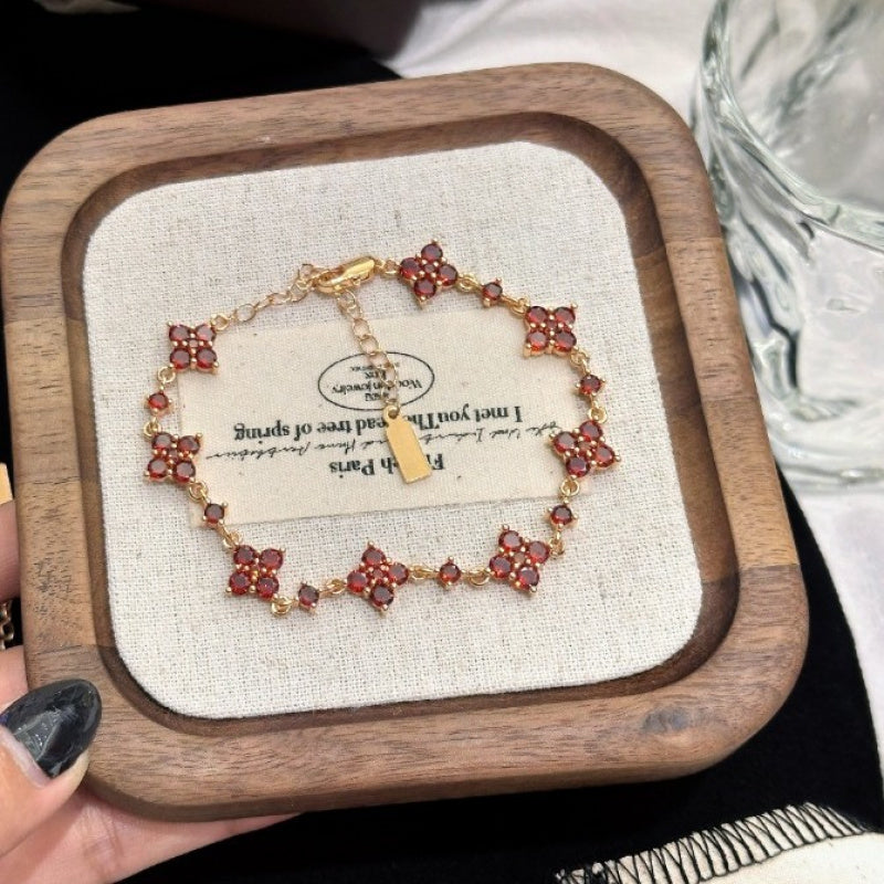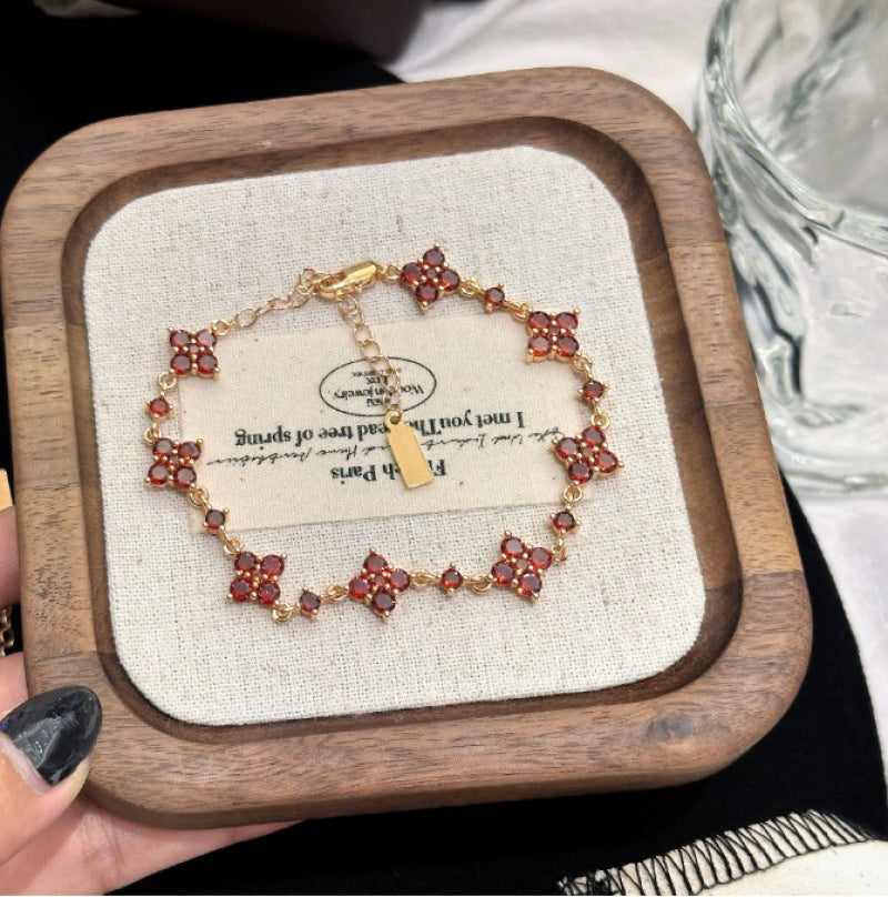 Fashionable, super shiny, French, high-end and elegant jewelry, red diamond four-leaf clover bracelet, workplace, party, gathering, birthday gift, outdoor